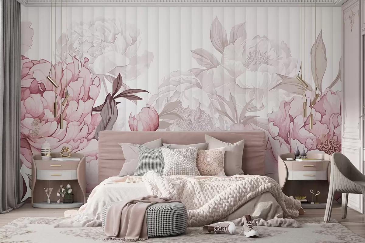 Zidne murale Pogled izbliza velikih, nježnih ružičastih i bijelih cvjetova božura na mekoj, teksturiranoj pozadini br. w08255