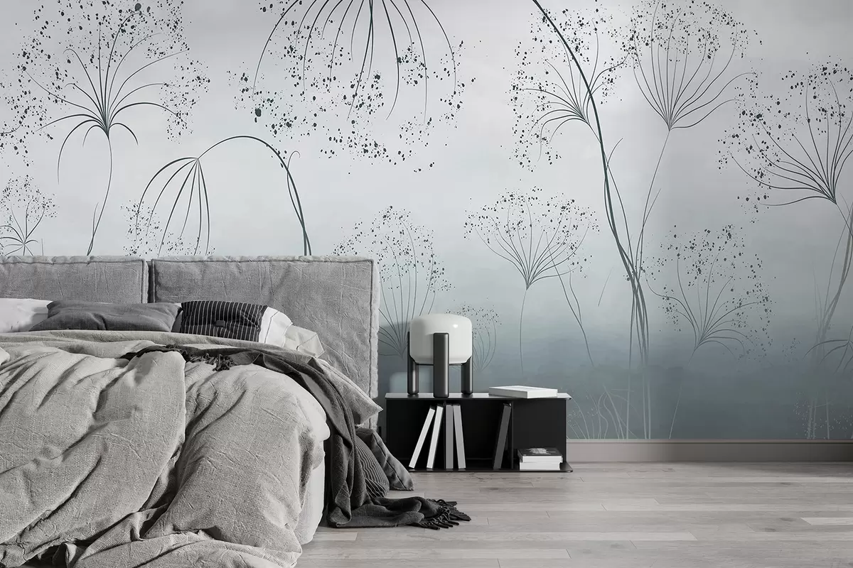 Zidne murale Plave visoke, pramenove biljke s nježnim cvjetovima u obliku kišobrana ili sjemenkama u maglovitom, atmosferskom okruženju br. w08258v1