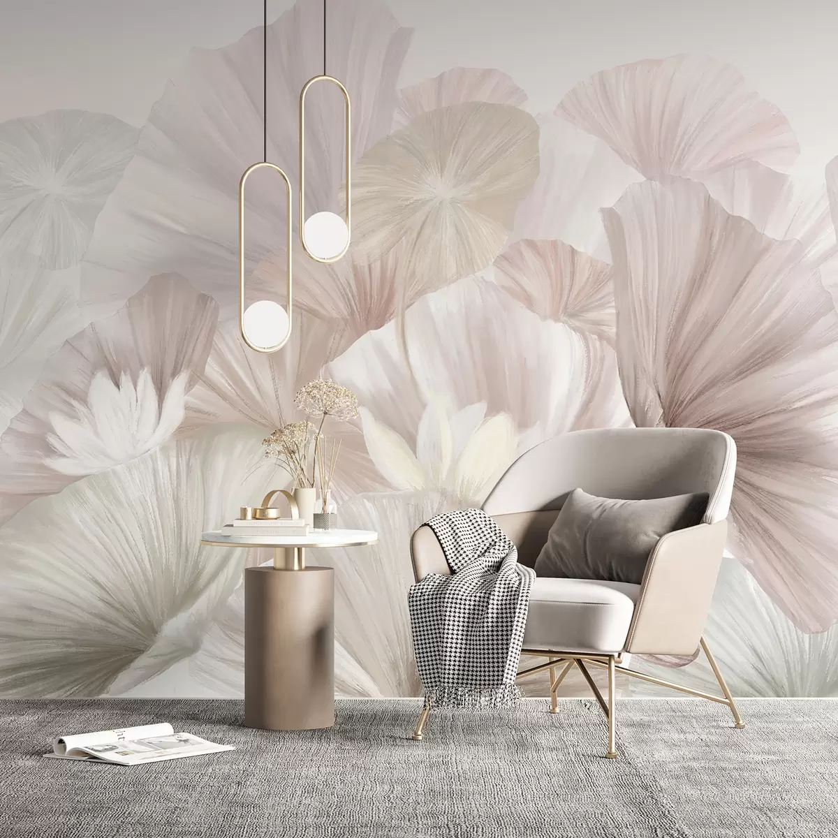 Zidne murale Nježno ružičasto lišće lotosa s bijelim cvjetovima s mekim, pernatim laticama raspoređenim u prirodnu umjetničku kompoziciju br. w08265v1