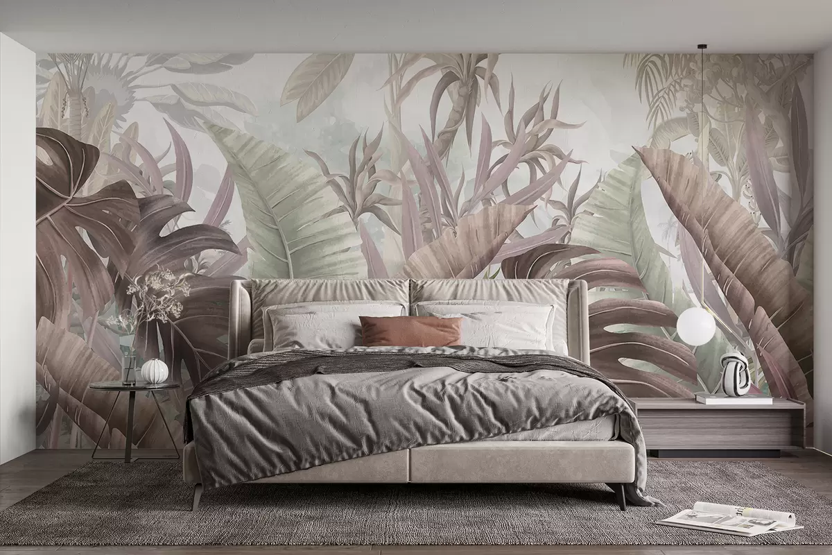 Zidne murale Tropska džungla s velikim palminim lišćem i egzotičnim biljkama u nijansama sive, bijele i bež boje br. w08307