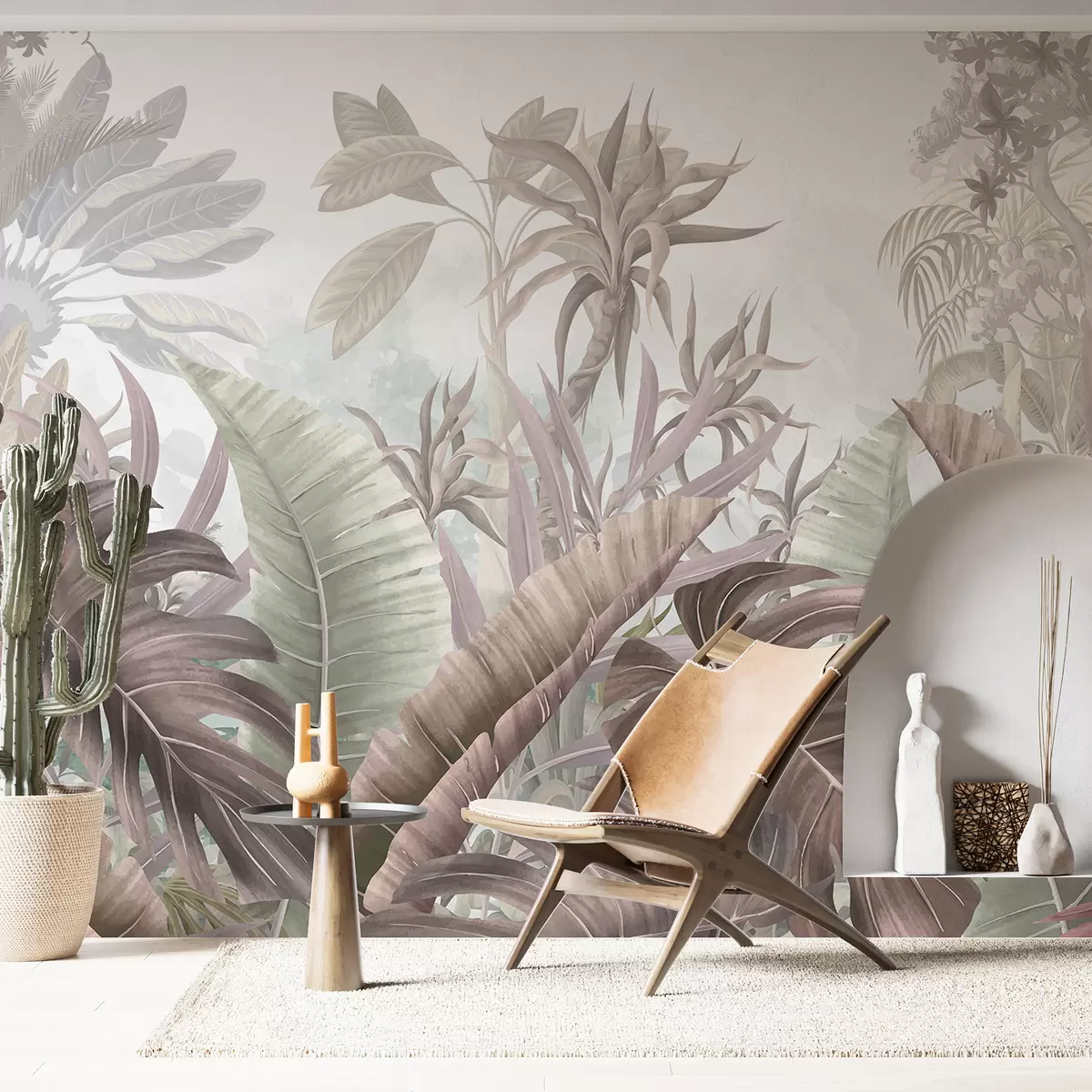 Zidne murale Tropska džungla s velikim palminim lišćem i egzotičnim biljkama u nijansama sive, bijele i bež boje br. w08307