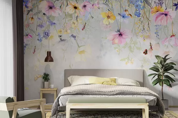 zidne murale Šareno cvijeće s ružičastim, žutim i plavim cvjetovima koji vise s vrha na teksturiranoj sivoj pozadini w08309
