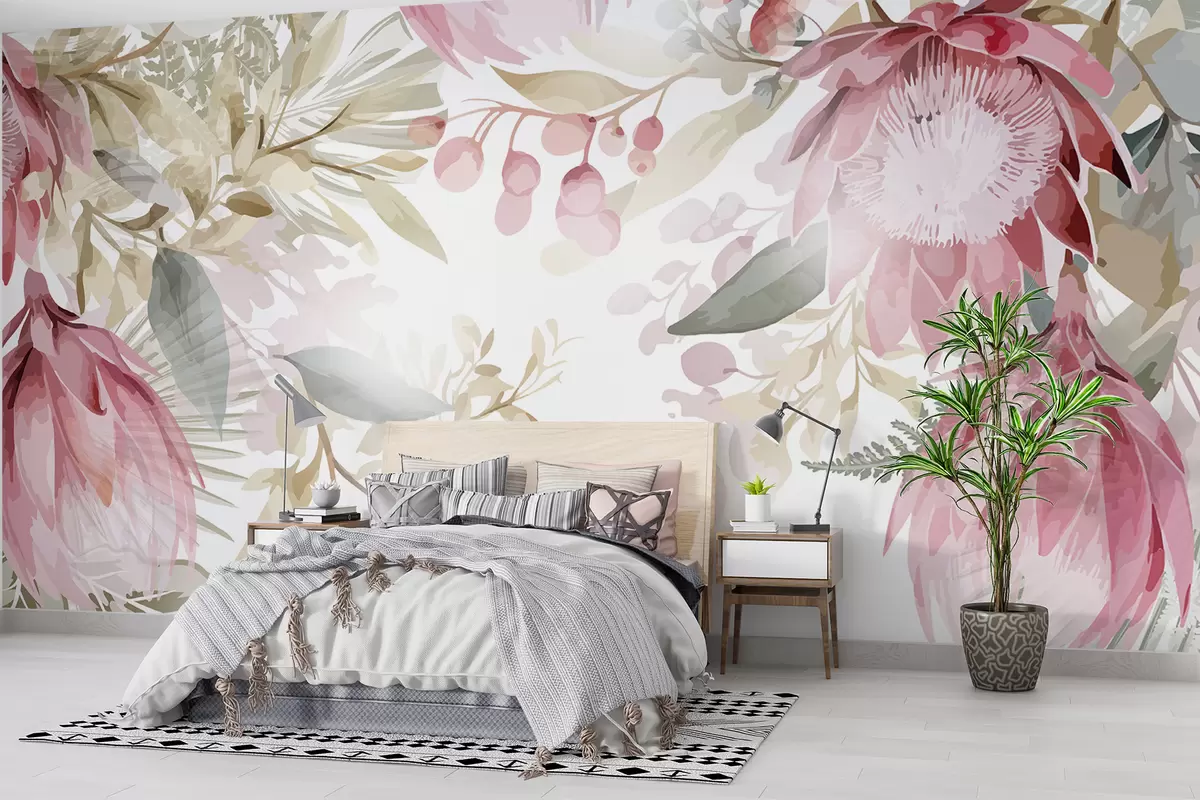 zidne murale Velike ružičaste i bijele prozirne proteje s bujnim zelenim lišćem na svijetloj pozadini w08315