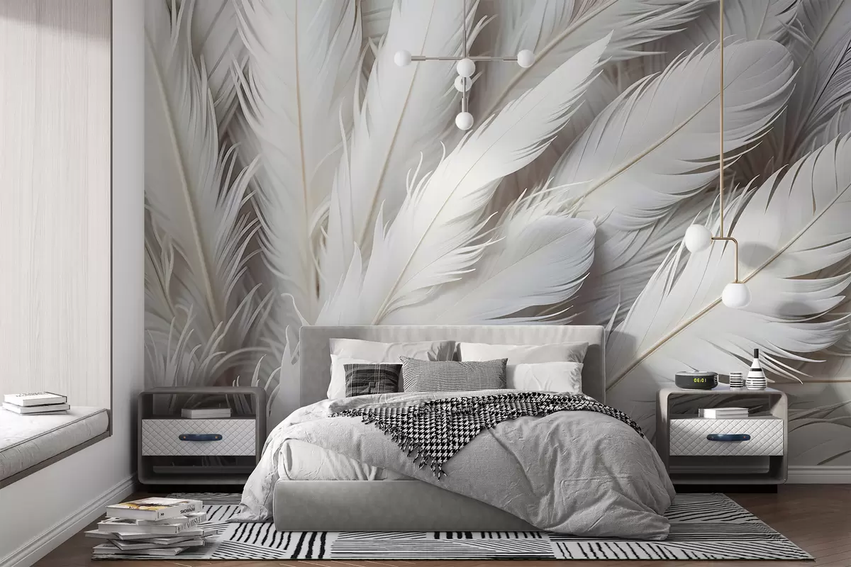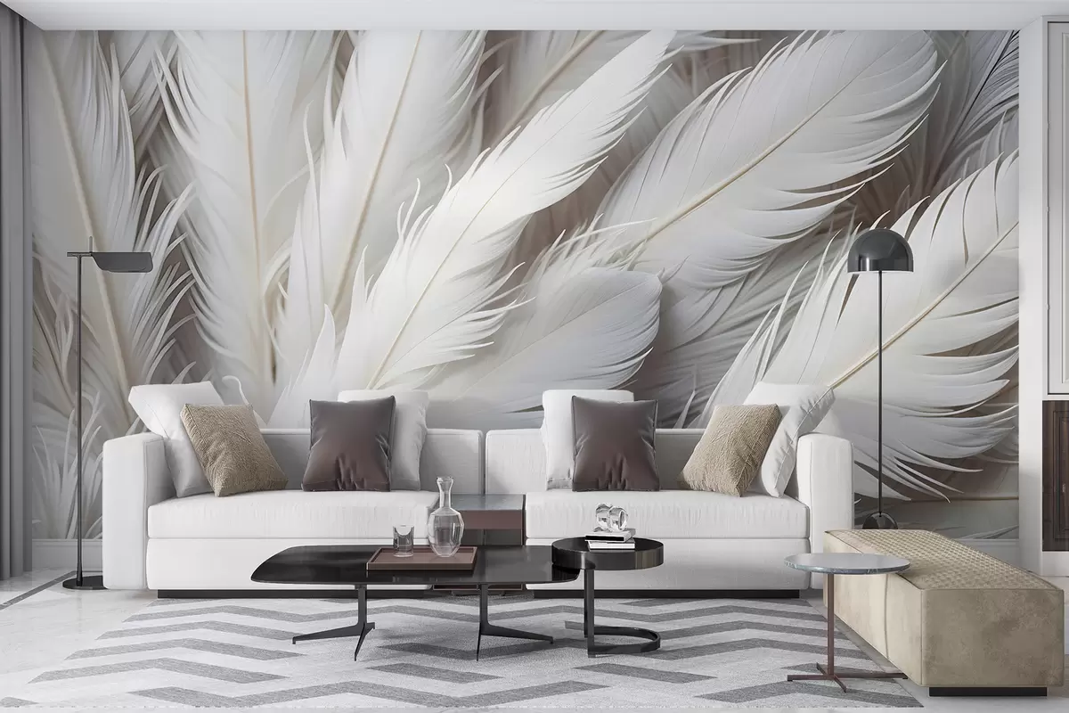 Zidne murale Mekano, pahuljasto bijelo perje s nježnom, pramenastom teksturom na svijetloj pozadini br. w08319