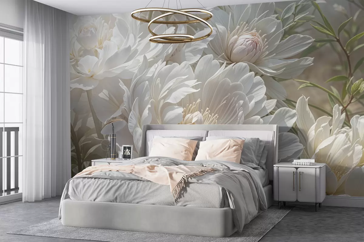 Zidne murale Krupni plan velikih, nježnih bijelih cvjetova božura s mekim, pahuljastim laticama i blijedožutim središtem br. w08325