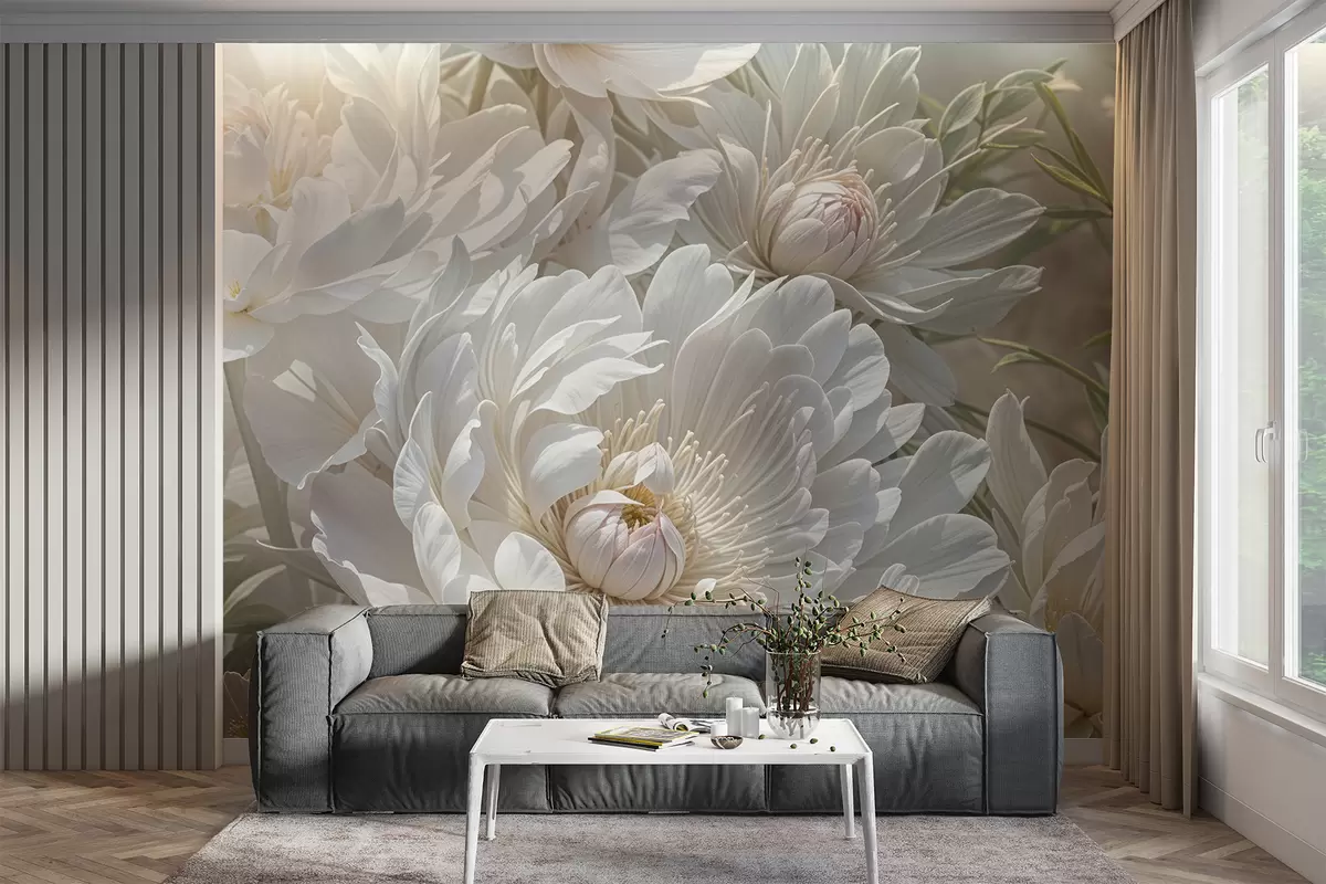Zidne murale Krupni plan velikih, nježnih bijelih cvjetova božura s mekim, pahuljastim laticama i blijedožutim središtem br. w08325