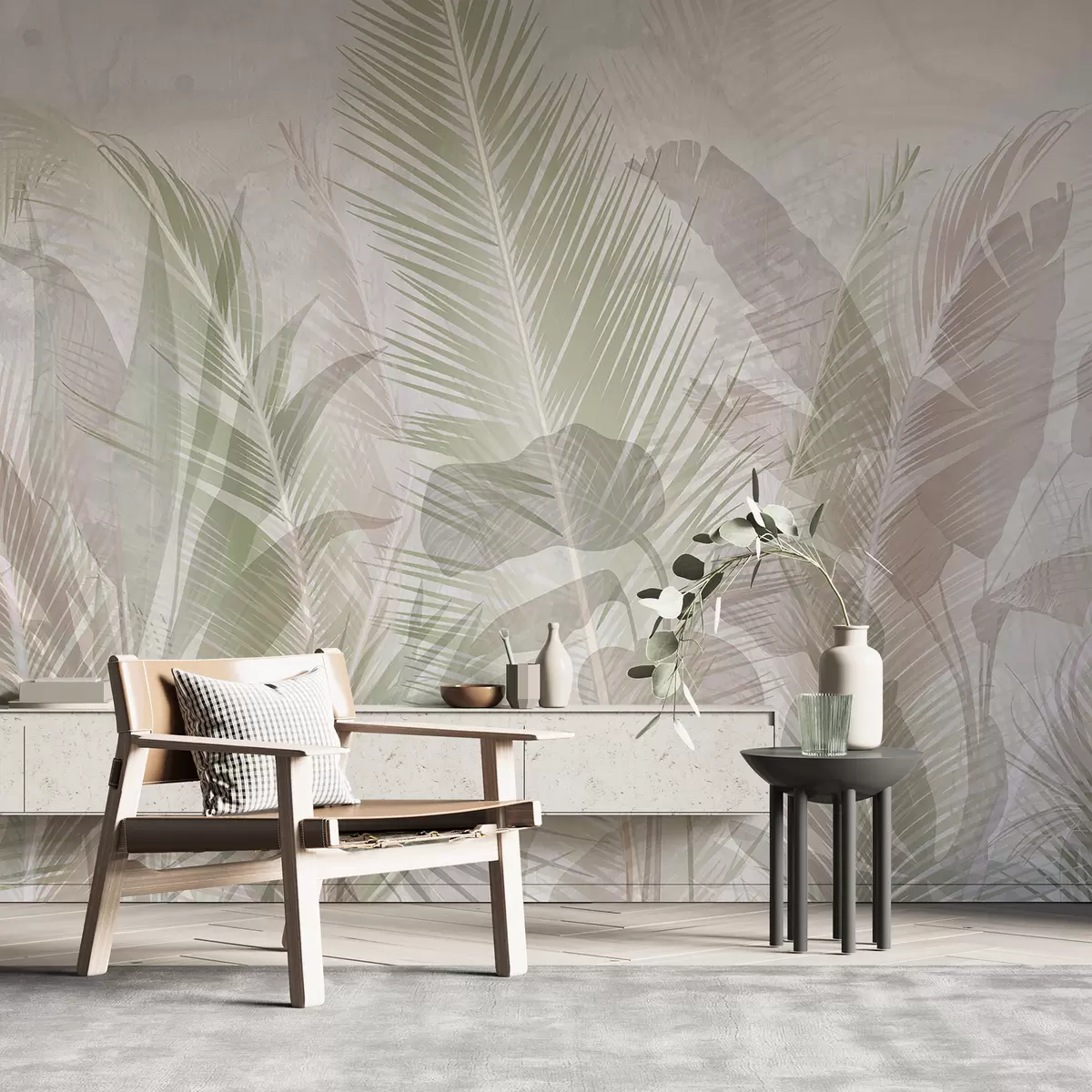 Zidne murale Tropsko palmino lišće u nježnim pastelnim bojama, s mutnom i maglovitom teksturiranom pozadinom br. w08326