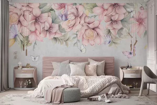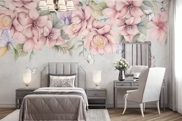 Zidne murale Nježno ružičasto i bijelo cvijeće s nježnim cvjetovima i lišćem na teksturiranoj sivoj pozadini br. w08331