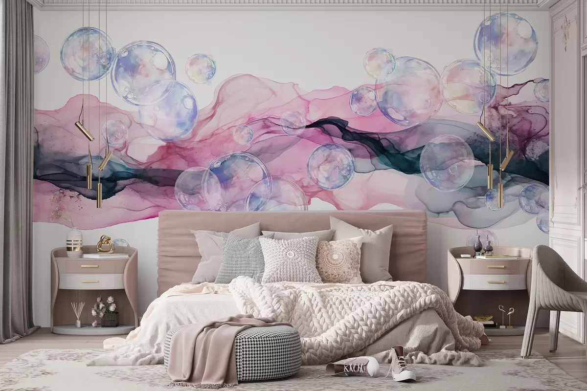 Zidne murale Šareni apstraktni tekući oblici s mjehurićima, kovitlacima ružičastih, plavih i ljubičastih nijansi na bijeloj pozadini br. w08337