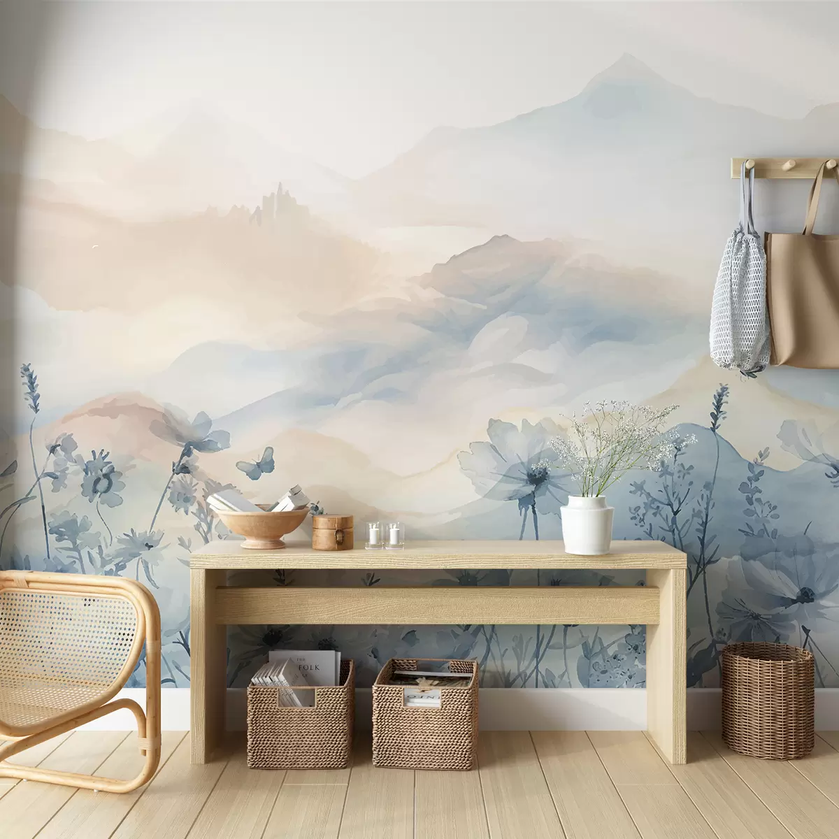 Zidne murale Miran krajolik s maglovitim planinskim lancem u pozadini, okružen poljem nježnog plavog cvijeća br. w08339