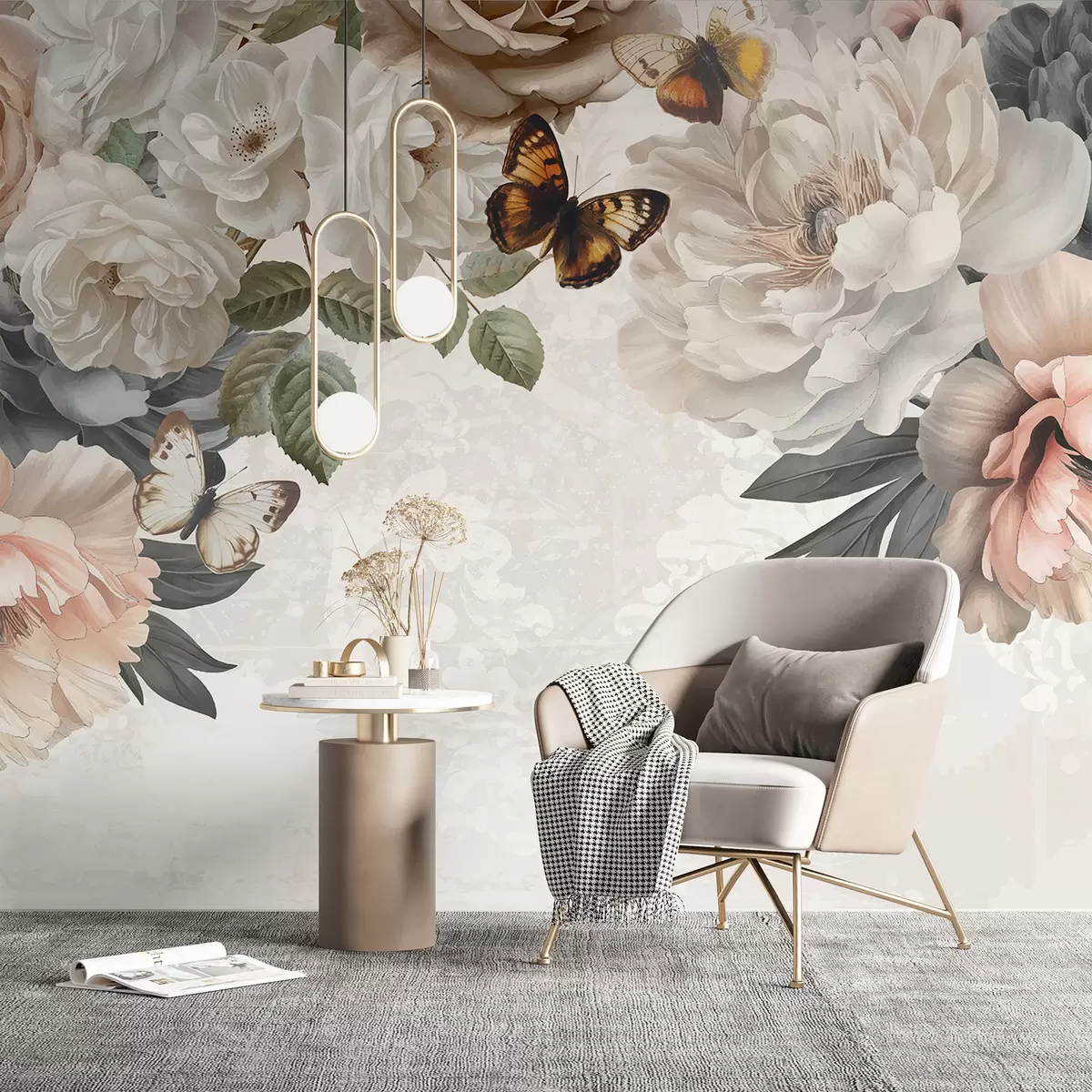 Zidne murale Veliki bijeli i ružičasti cvjetovi božura s leptirom koji sjedi na jednom od cvjetova na mekoj, zamućenoj pozadini br. w08340