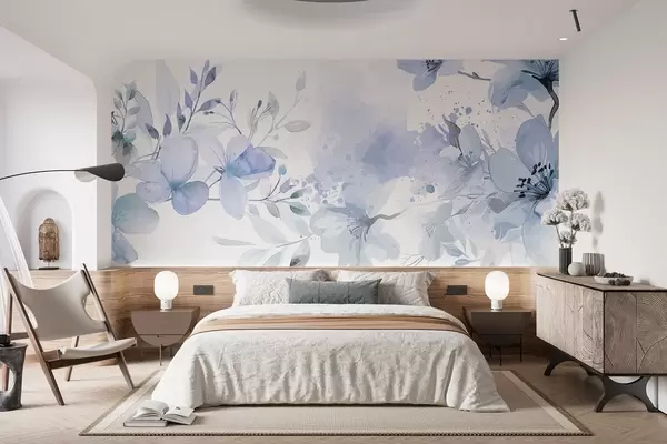Zidne murale Buket nježnog plavog i bijelog cvijeća s mekim, zamućenim laticama na svijetloj, prozračnoj pozadini akvarela br. w08348v1