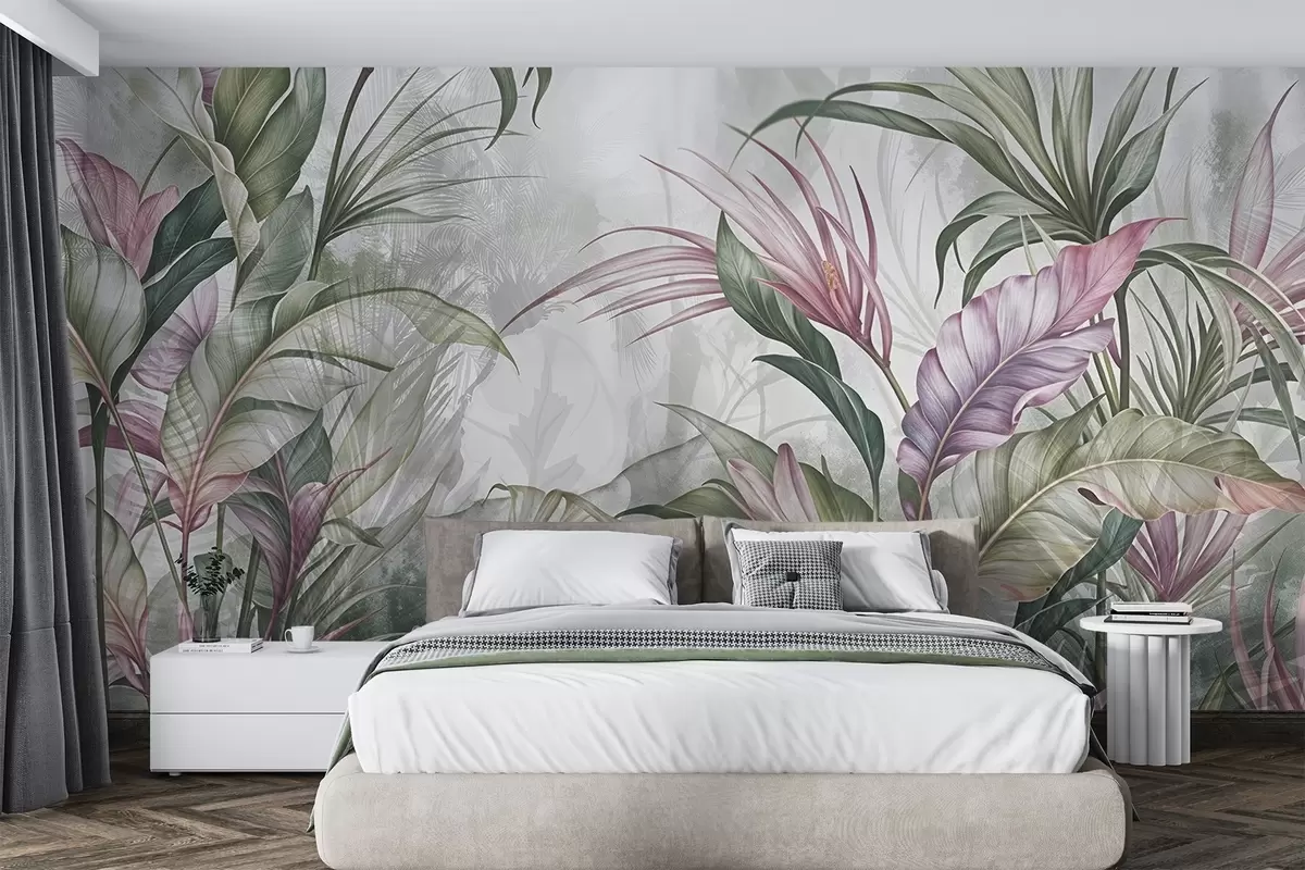 Zidne murale Tropska džungla s velikim zelenim lišćem i ružičastim cvjetovima protee s zamućenom teksturiranom pozadinom br. w08375