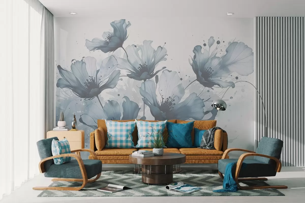 Zidne murale Nježno plavo cvijeće s mekim, zamućenim laticama i mrljama akvarela na svijetloj pozadini br. w08376