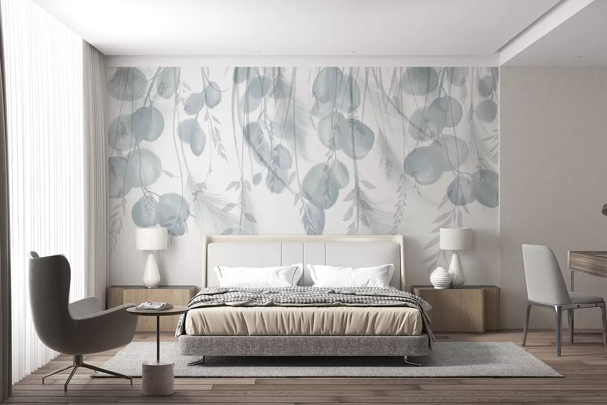 Zidne murale Nježno sivo i pastelno zeleno lišće eukaliptusa pada, stvarajući spokojnu i umirujuću atmosferu br. w08380