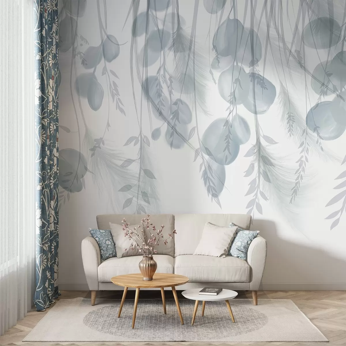 Zidne murale Nježno sivo i pastelno zeleno lišće eukaliptusa pada, stvarajući spokojnu i umirujuću atmosferu br. w08380