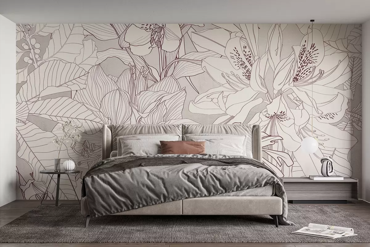 Zidne murale Detaljan bordo i sivi cvjetni print s raznim vrstama cvijeća i lišća, bujni, složeni botanički dizajn br. w08385