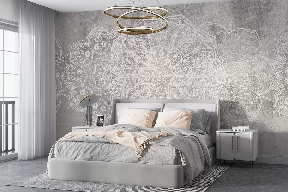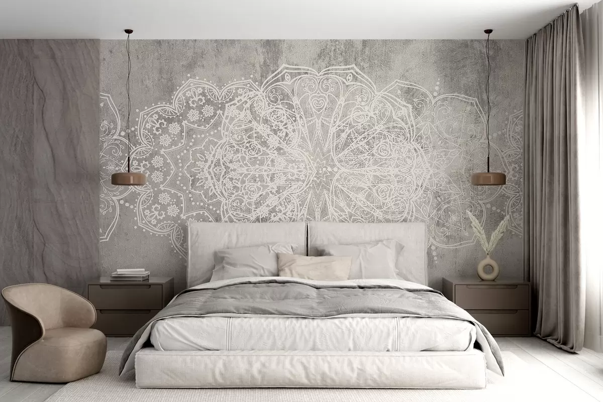 Zidne murale Detaljan, zamršen bijeli čipkasti uzorak mandale na teksturiranoj pozadini sivog zida potkrovlja br. w08387
