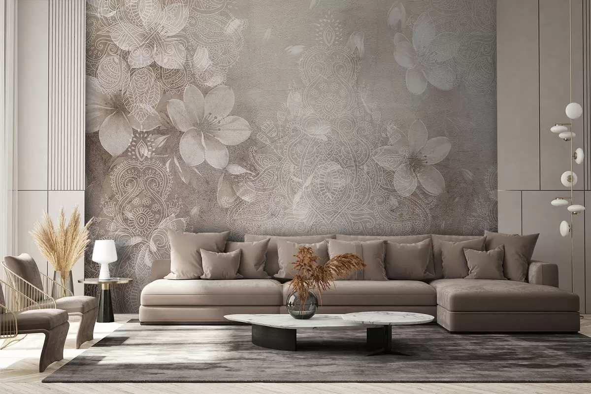 Zidne murale Crtež mekog fokusa nježnog bijelog cvijeća na zamućenoj čipkastoj bež pozadini br. w08405v1