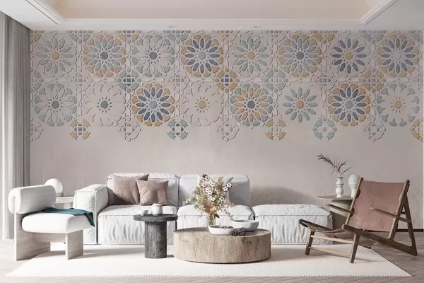 Zidne murale Teksturirani zid s ponavljajućim ispisom zamršenih, kićenih dizajna u nijansama plave, sive i bež boje br. w08407