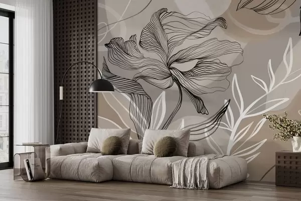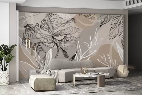 Zidne murale Elegantan cvjetni print s velikim apstraktnim linijama cvijeća i lišća u nijansama sive i bež na svijetloj pozadini br. w08413