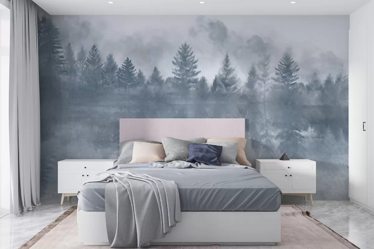 Zidne murale Miran krajolik sa zaleđenim jezerom okruženim gustom borovom šumom, s maglovitom atmosferom br. w08415
