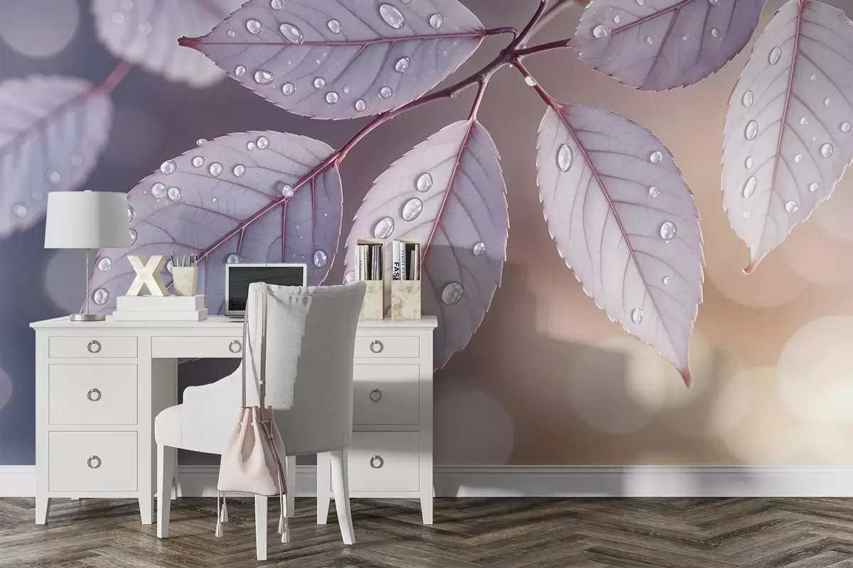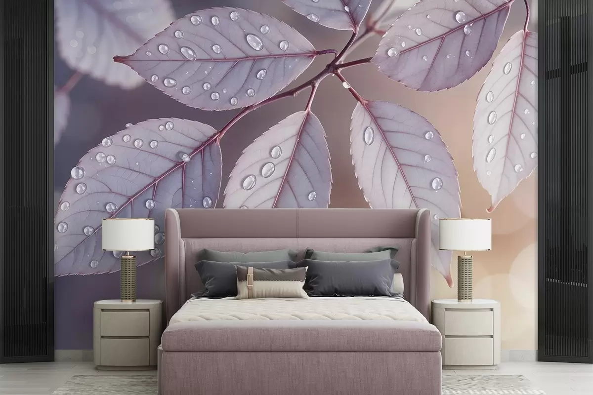zidne murale Nježno ljubičasto lišće s kapljicama vode, pozadina mekog fokusa w08419