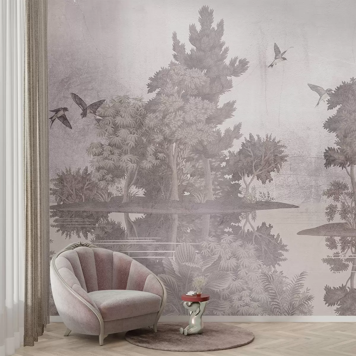 Zidne murale Ispis šumskog pejzaža s jezerom okruženim borovima i drugim lišćem na teksturnoj bež pozadini br. w08426