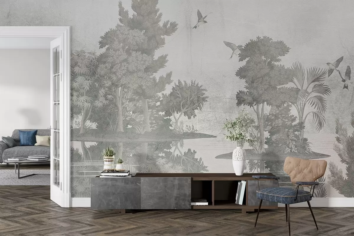 Zidne murale Ispis šumskog pejzaža s jezerom okruženim borovima i drugim lišćem na teksturnoj zelenoj pozadini br. w08426v1