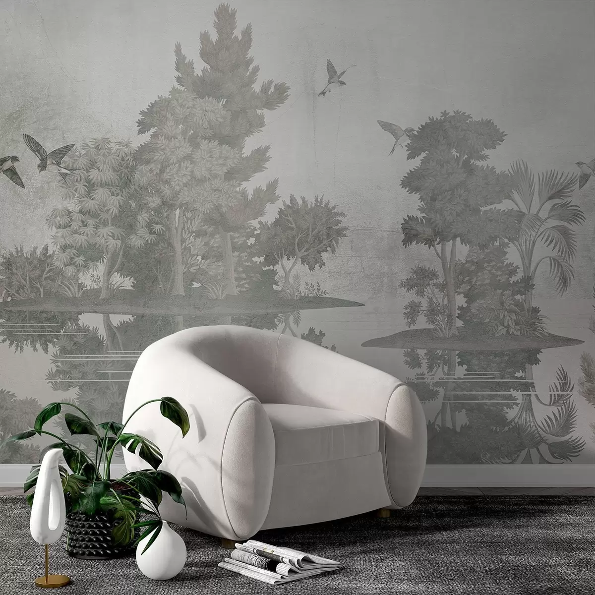 Zidne murale Ispis šumskog pejzaža s jezerom okruženim borovima i drugim lišćem na teksturnoj zelenoj pozadini br. w08426v1