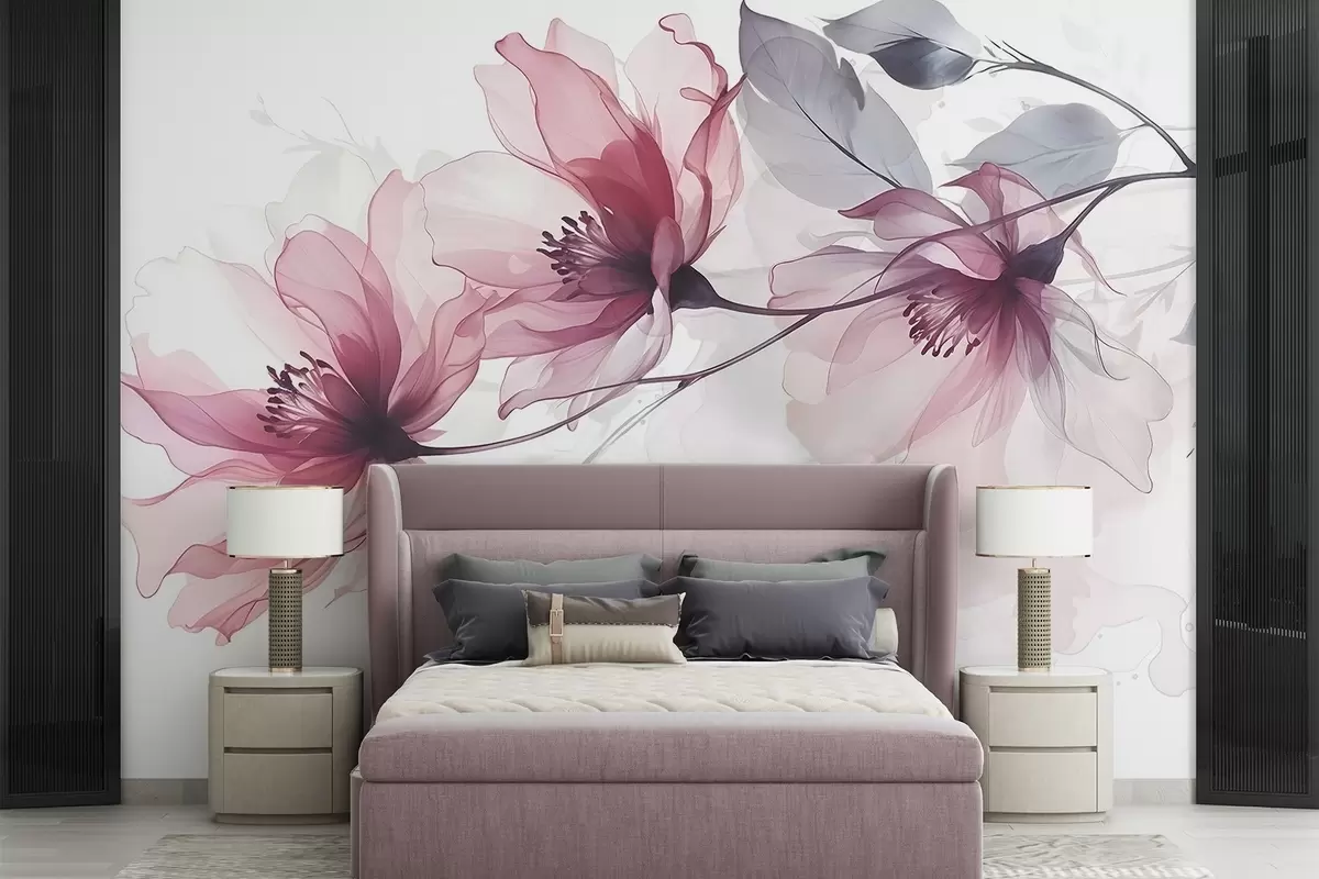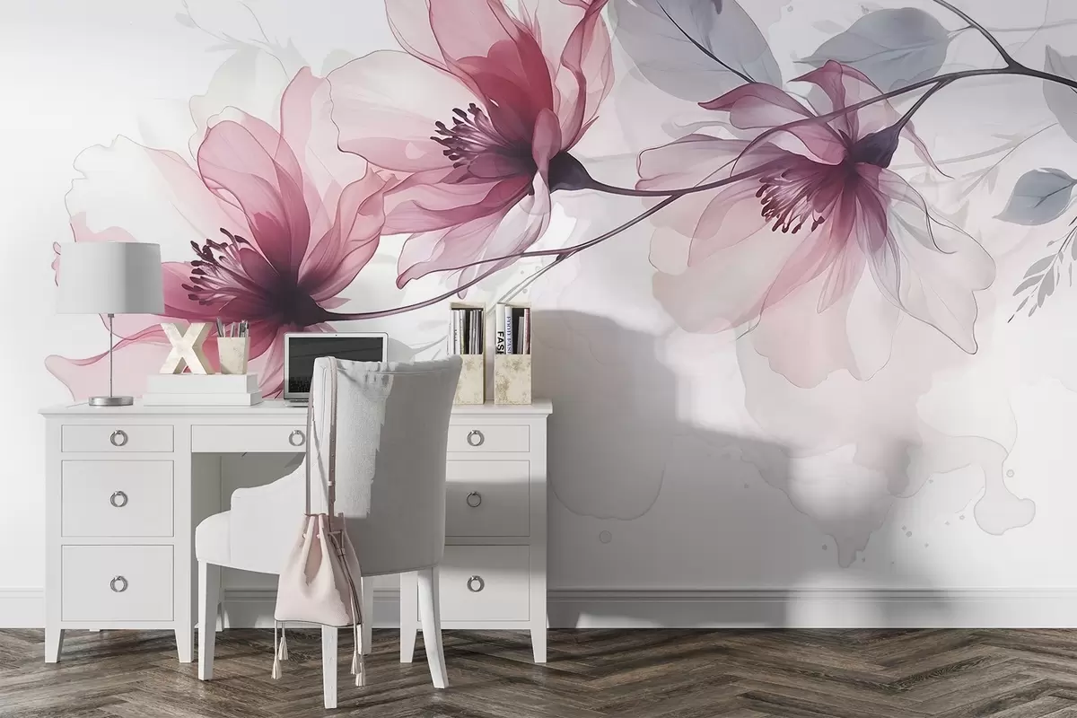 Zidne murale Nježni prozirni ružičasti i sivi cvjetovi s mekim, zamućenim laticama na bijeloj pozadini br. w08429