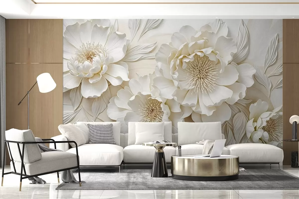 Zidne murale Elegantna voluminozna imitacija bijelog cvijeća božura s mekim laticama i pastelno žutim središtem, na svijetloj pozadini br. w08431