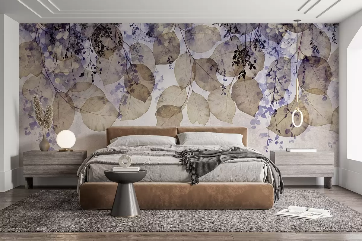Zidne murale Nježno suho lišće i cvijeće u nijansama ljubičaste, bež i bijele na svijetloj teksturnoj pozadini br. w08447