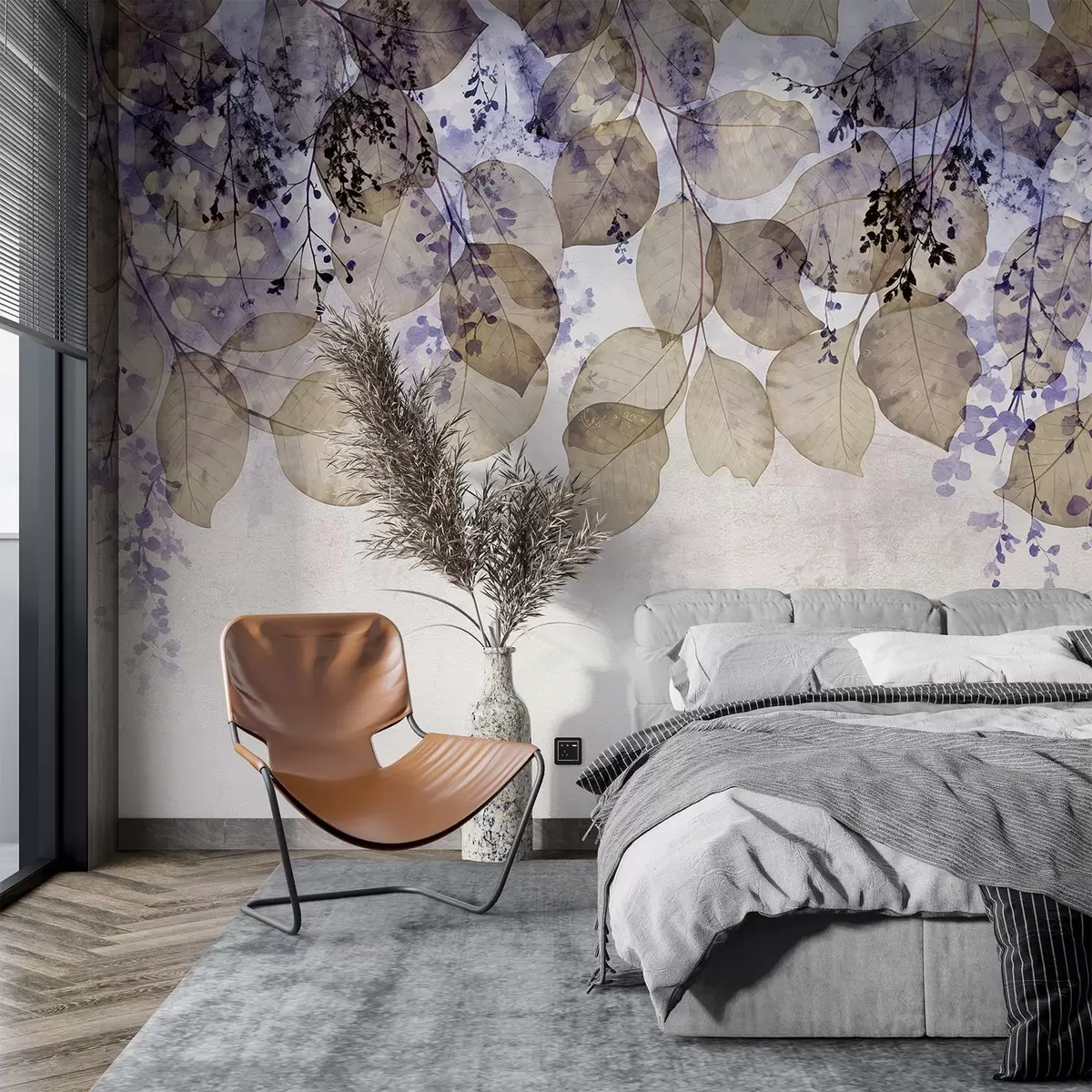 Zidne murale Nježno suho lišće i cvijeće u nijansama ljubičaste, bež i bijele na svijetloj teksturnoj pozadini br. w08447