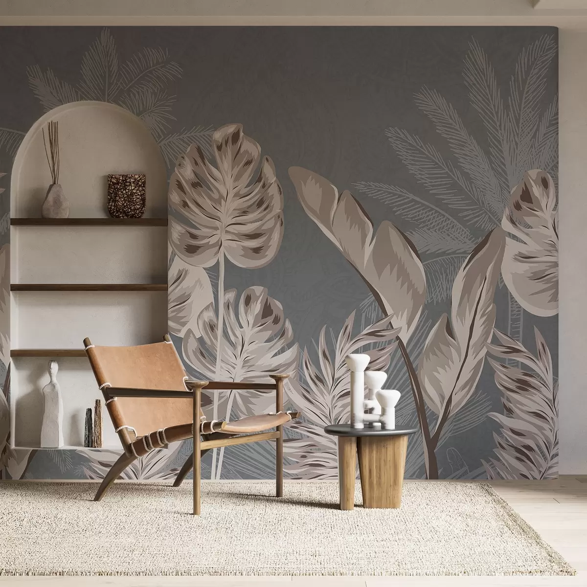 Zidne murale Veliko, nježno bež lišće na prigušenoj sivoj pozadini stvara spokojnu i eteričnu atmosferu br. w08449
