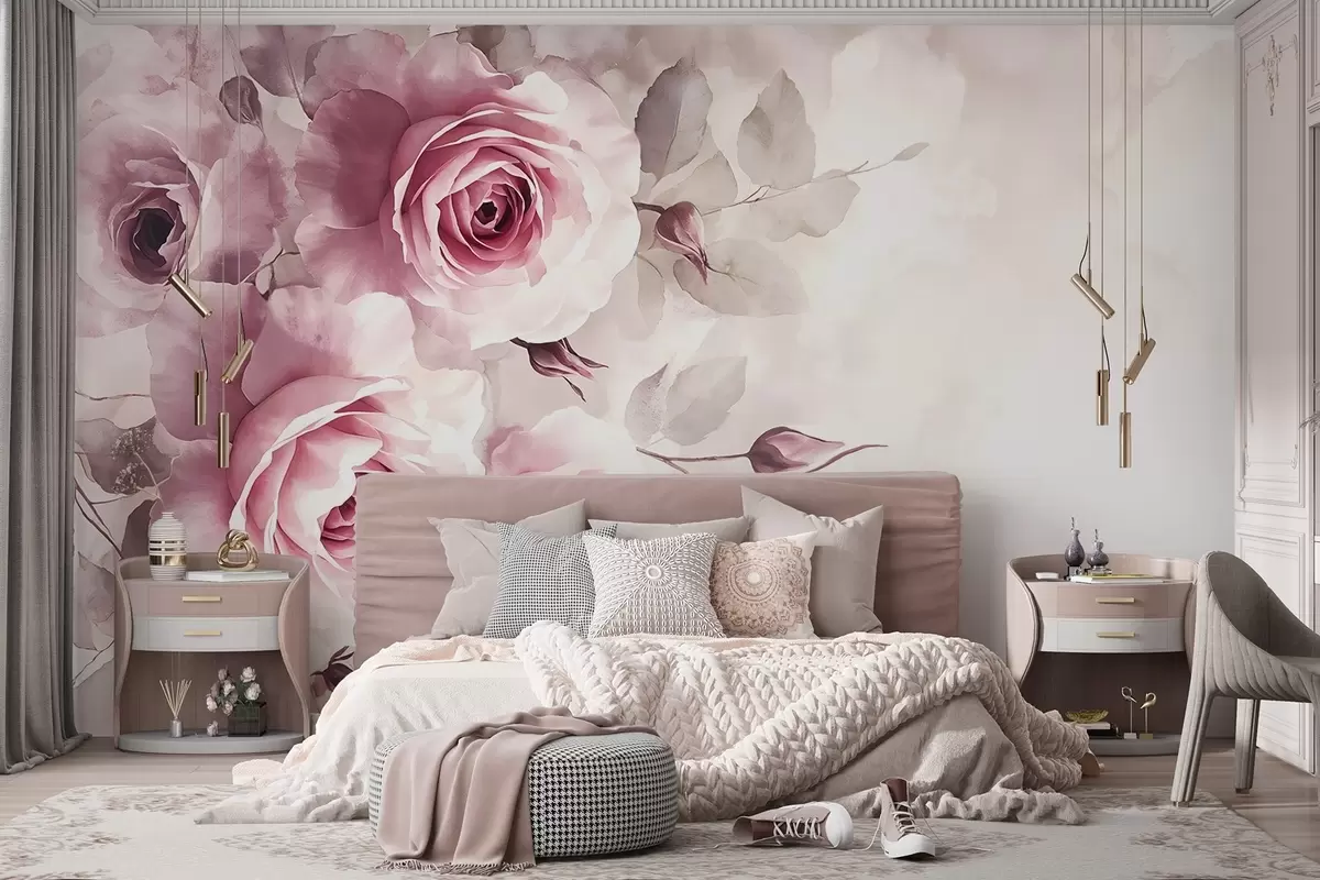 Zidne murale Nježne pastelno ružičaste ruže i lišće s mekom, zamućenom imitacijom pozadine akvarela br. w08459