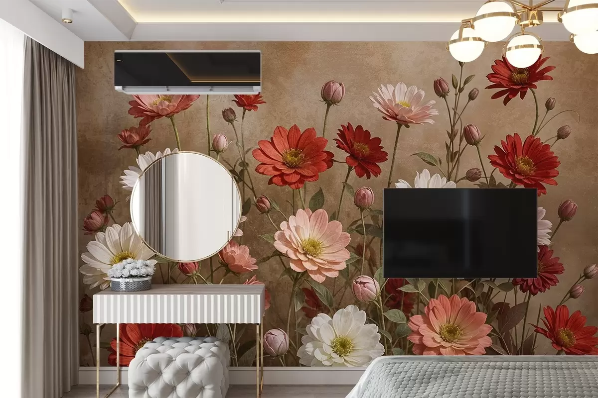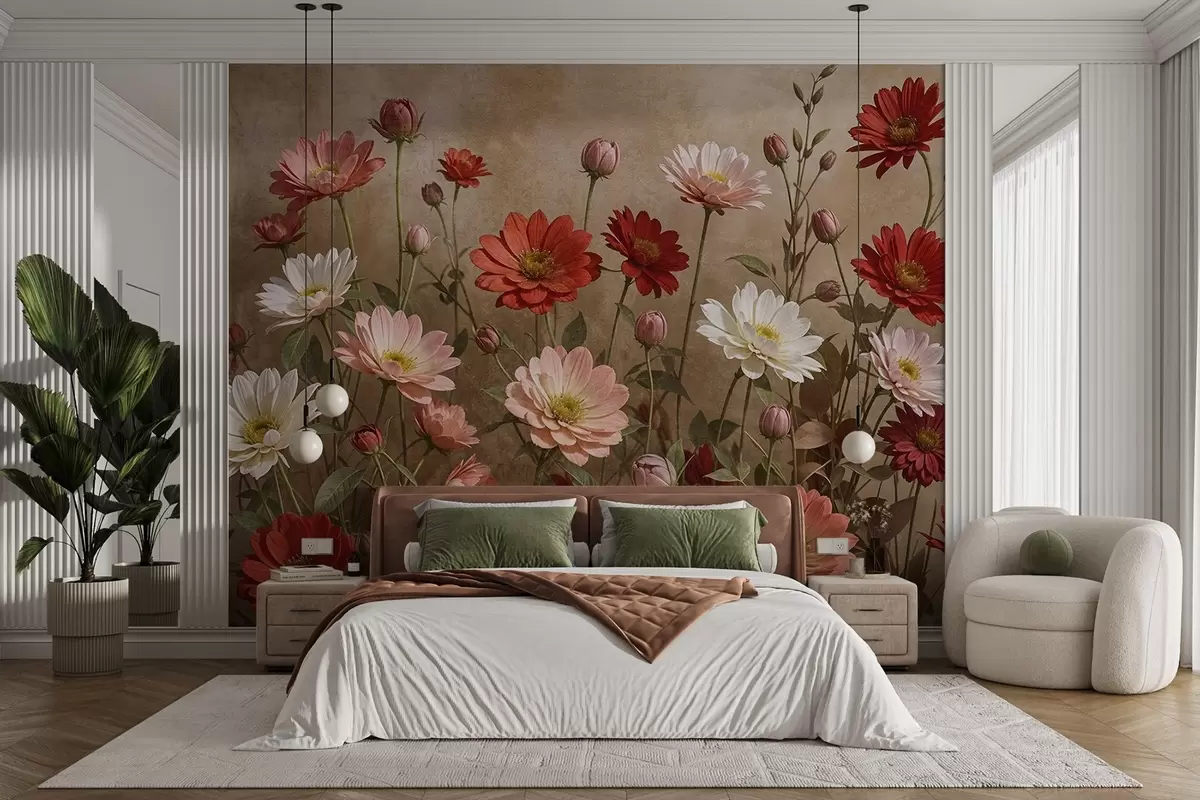 Zidne murale Polje šarenih cvjetova nalik tratinčicama u raznim nijansama ružičaste, crvene i bijele na teksturiranoj pozadini br. w08462
