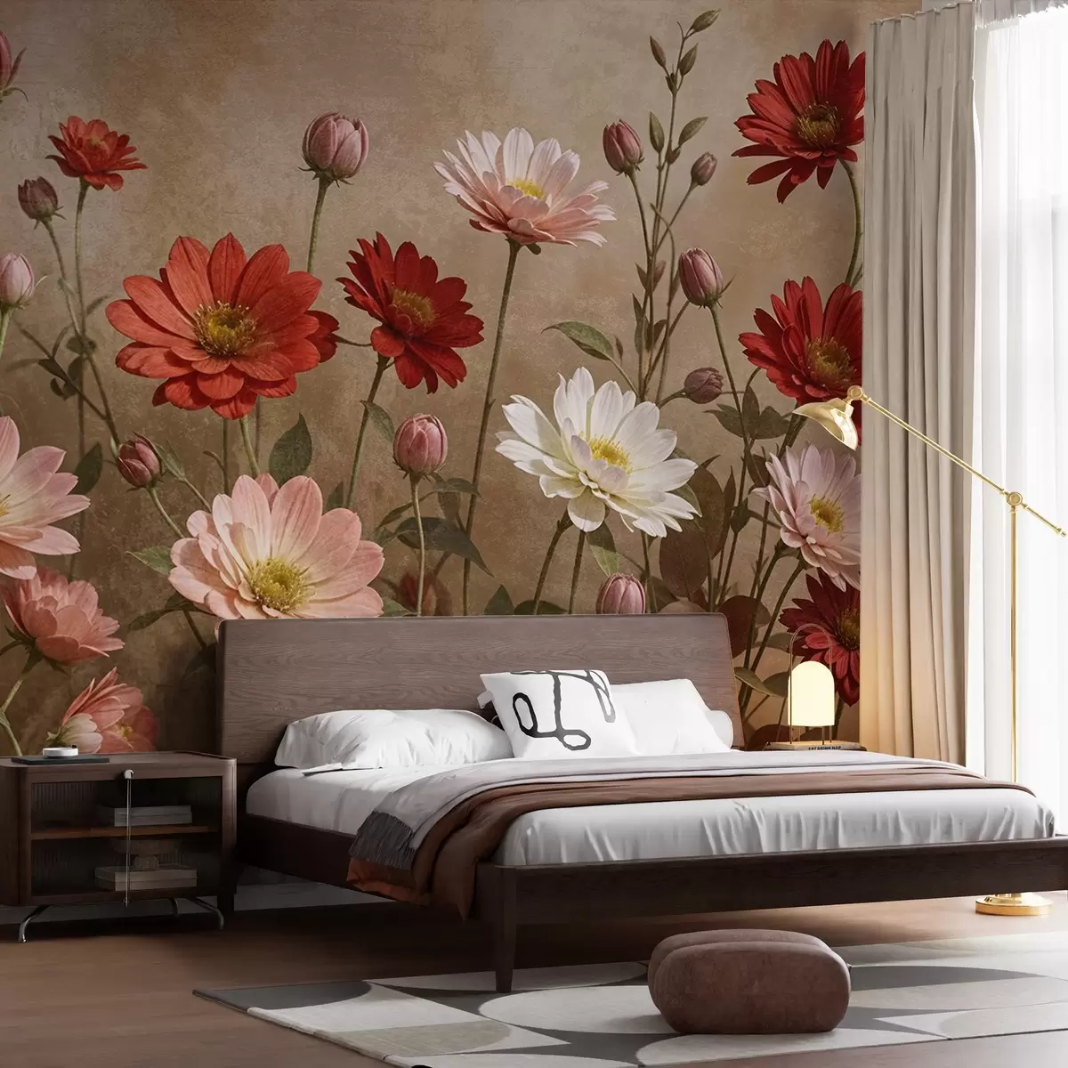 Zidne murale Polje šarenih cvjetova nalik tratinčicama u raznim nijansama ružičaste, crvene i bijele na teksturiranoj pozadini br. w08462