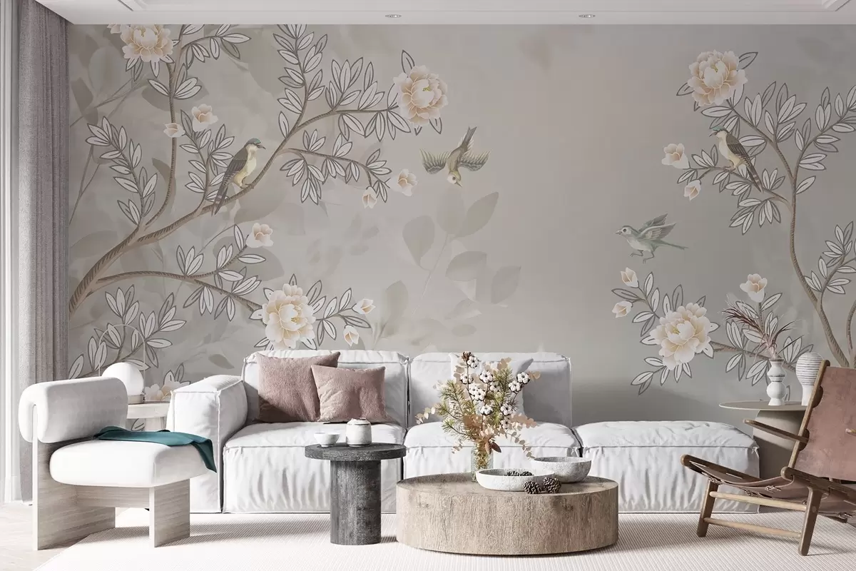 Zidne murale Grane s ružama i letećim pticama u svijetlim tonovima br. w08493