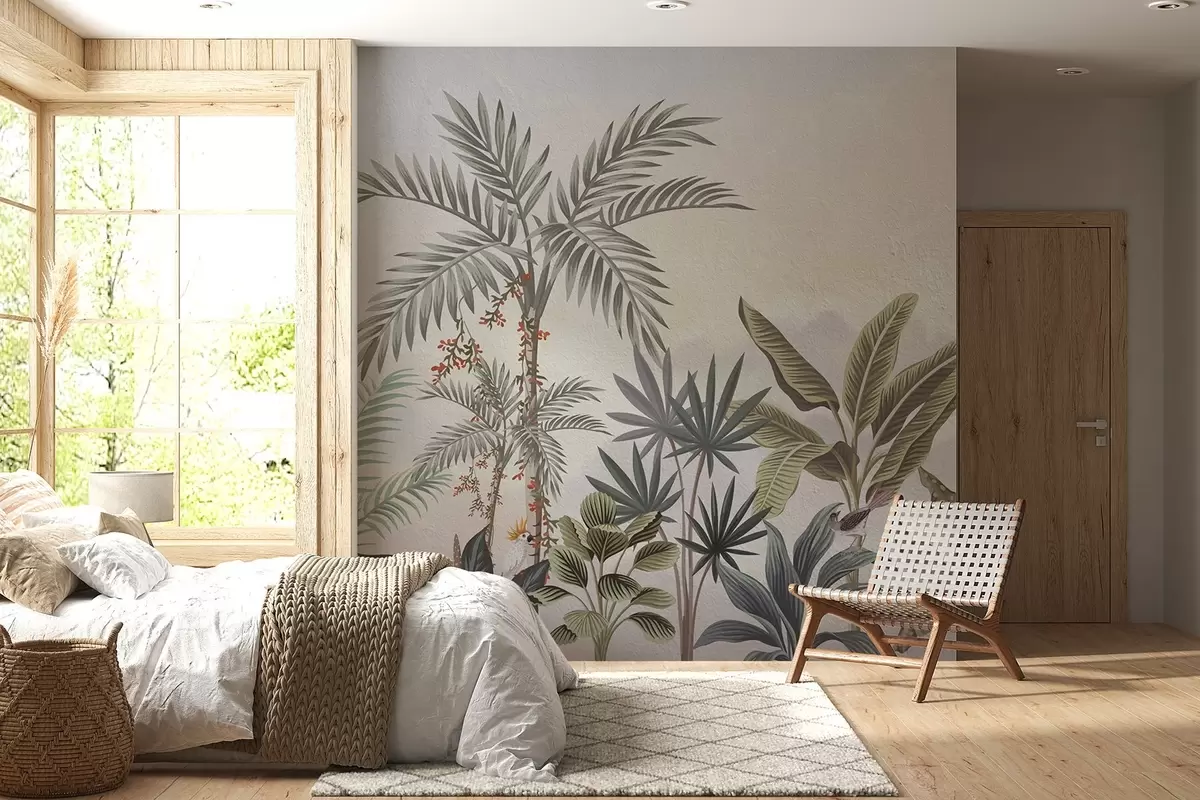 Zidne murale Tropska džungla s palmama i šarenim pticama br. w08496
