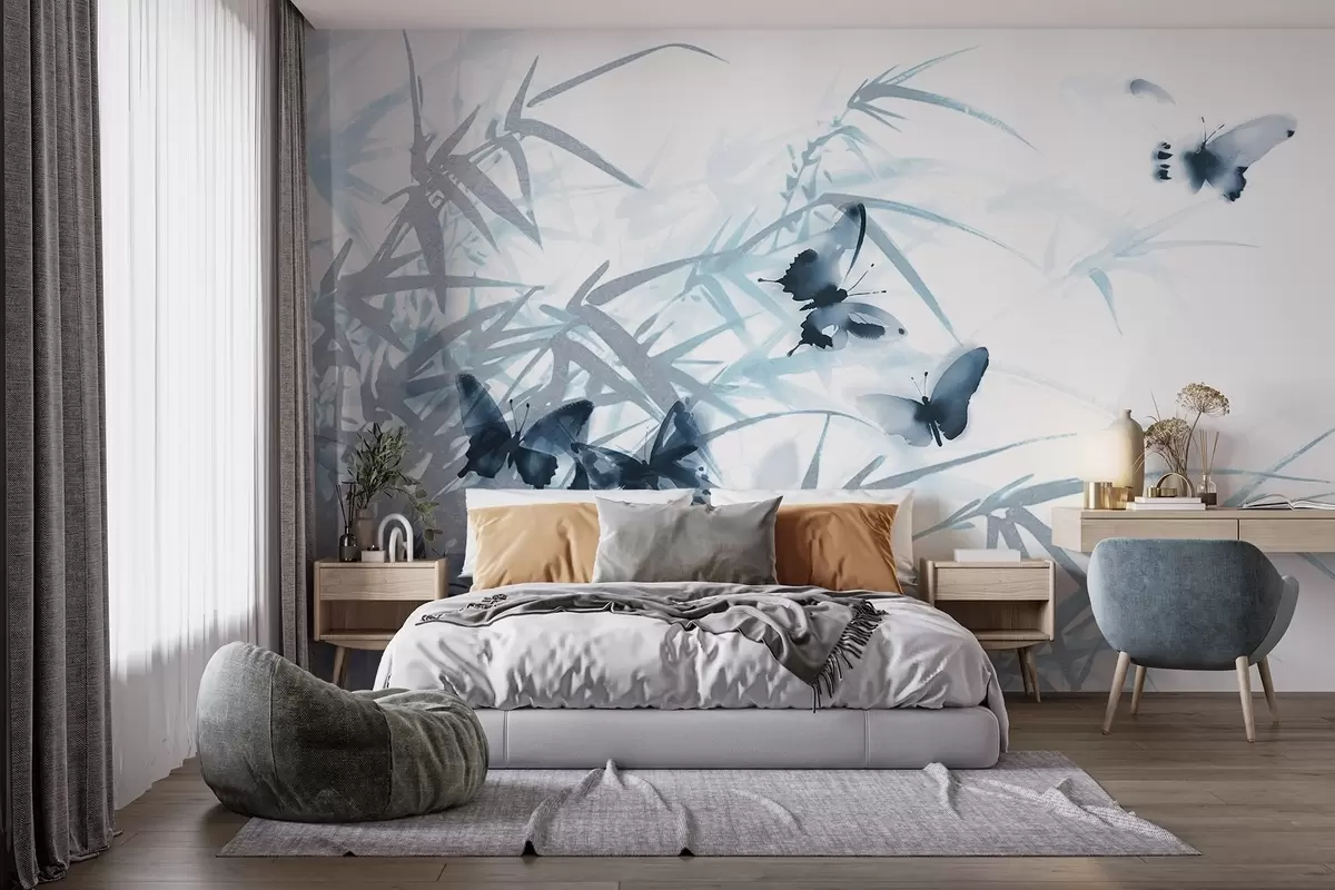 Zidne murale Teksturalno lišće i stabljike bambusa s letećim plavim leptirima s prozirnim krilima br. w08524