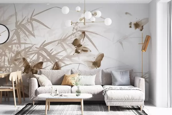 Zidne murale Teksturalno lišće i stabljike bambusa s letećim smeđim leptirima s prozirnim krilima br. w08524v1