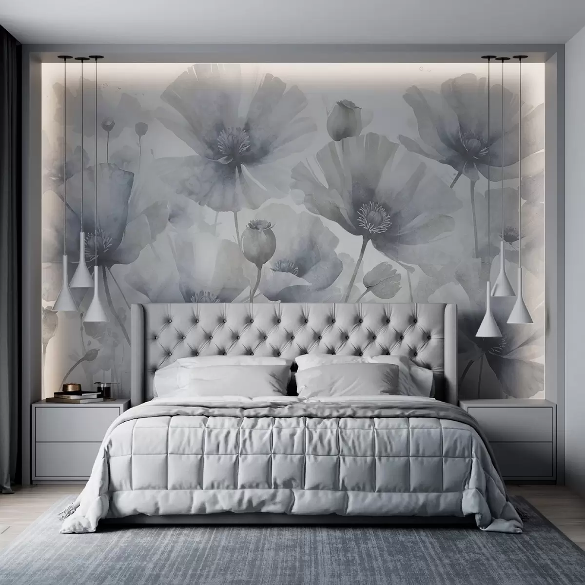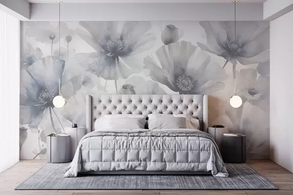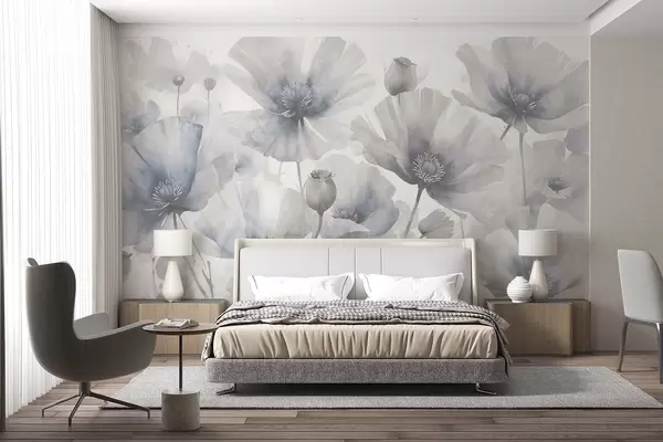 Zidne murale Nježni teksturni grunge sivi i bijeli cvjetovi s mekim, zamućenim laticama na bijeloj pozadini br. w08526