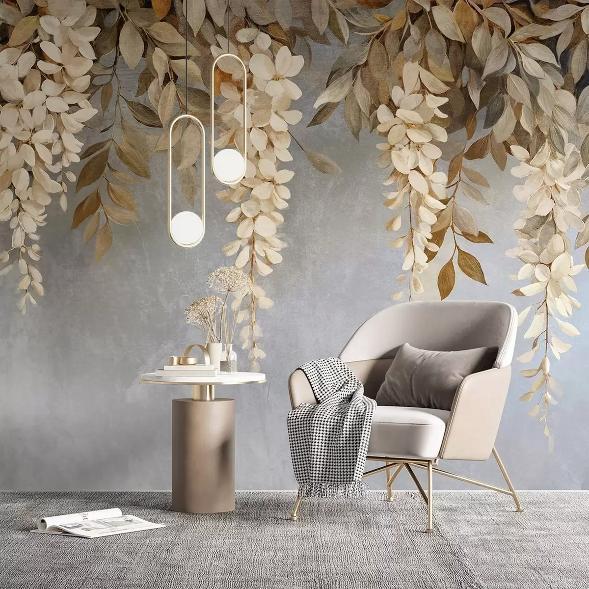 Zidne murale Nježni bijeli i svijetlo bež cvjetovi glicinije s lišćem koje se spušta prema nježno sivoj pozadini br. w08531
