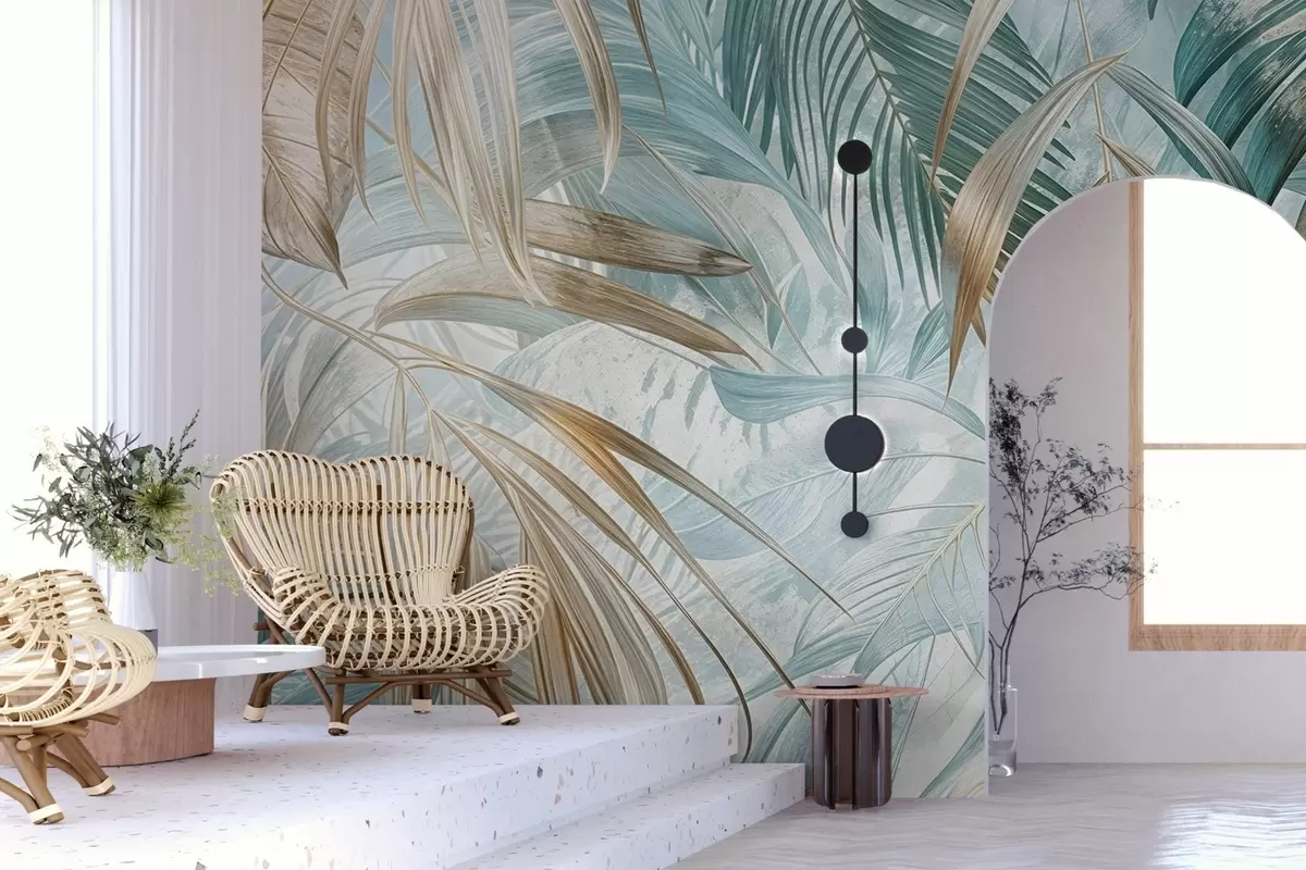 Zidne murale Tropski apstraktni cvjetni print s velikim palminim lišćem u nijansama plave i bež boje stvara raskošnu atmosferu br. w08532