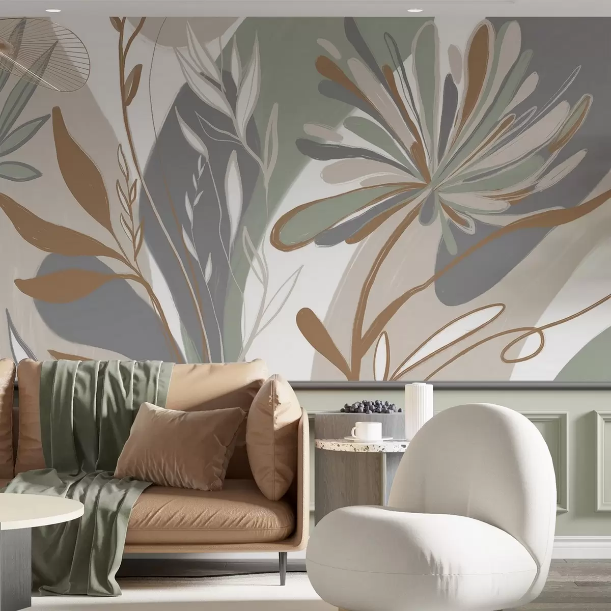 Zidne murale Apstraktni cvjetni minimalistički print sa stiliziranim lišćem i laticama u nijansama zelene, sive i bež boje br. w08536