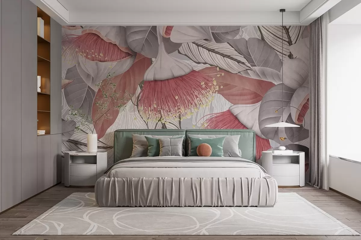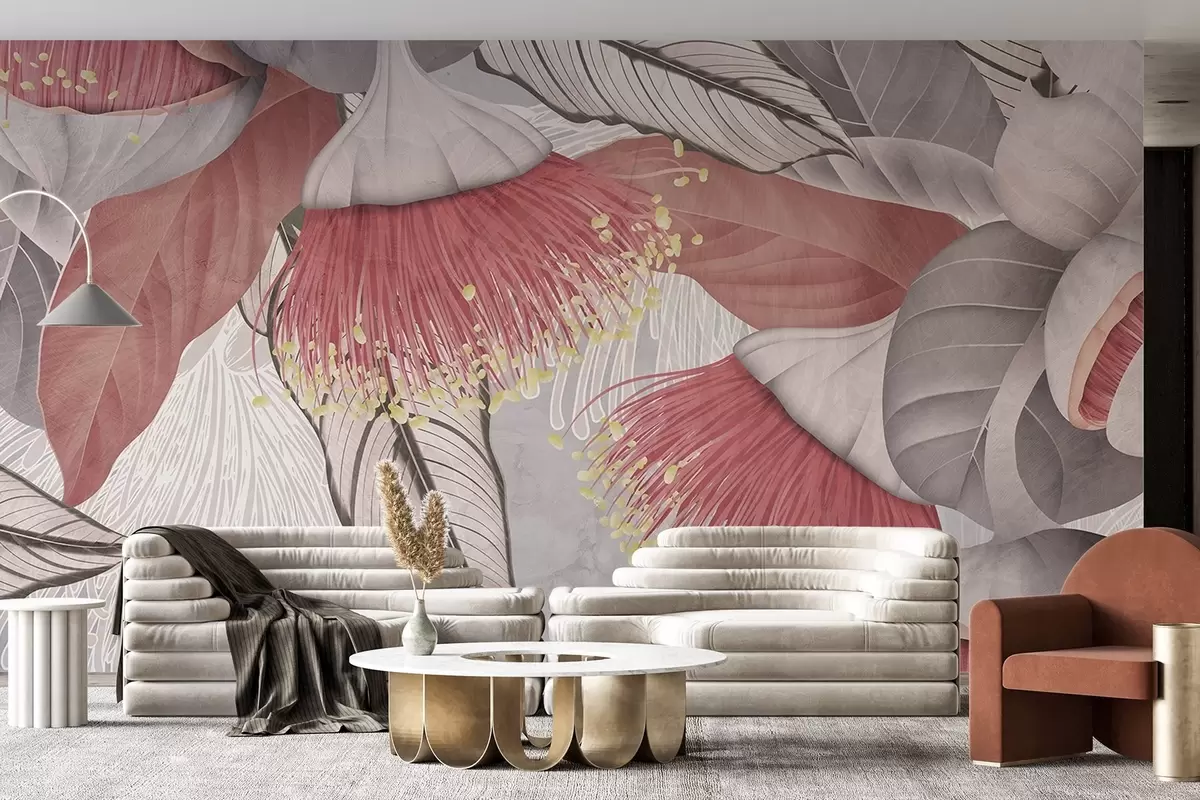 Zidne murale Botanička ilustracija velikih cvjetova eukaliptusa s dugim prašnicima na sivoj i bijeloj pozadini br. w08539