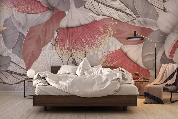 Zidne murale Botanička ilustracija velikih cvjetova eukaliptusa s dugim prašnicima na sivoj i bijeloj pozadini br. w08539