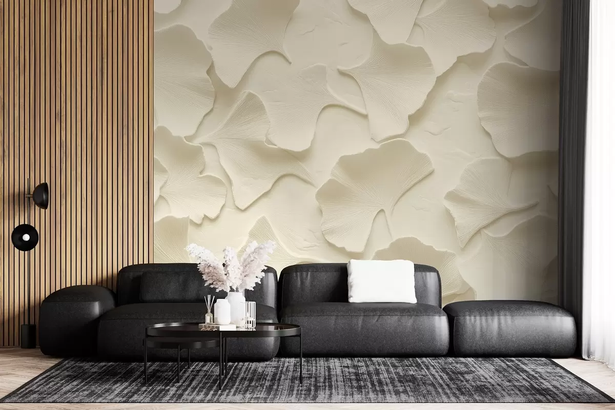 Zidne murale Štukatura s nježnim reljefnim lišćem ginka na nježno bež podlozi br. w08560