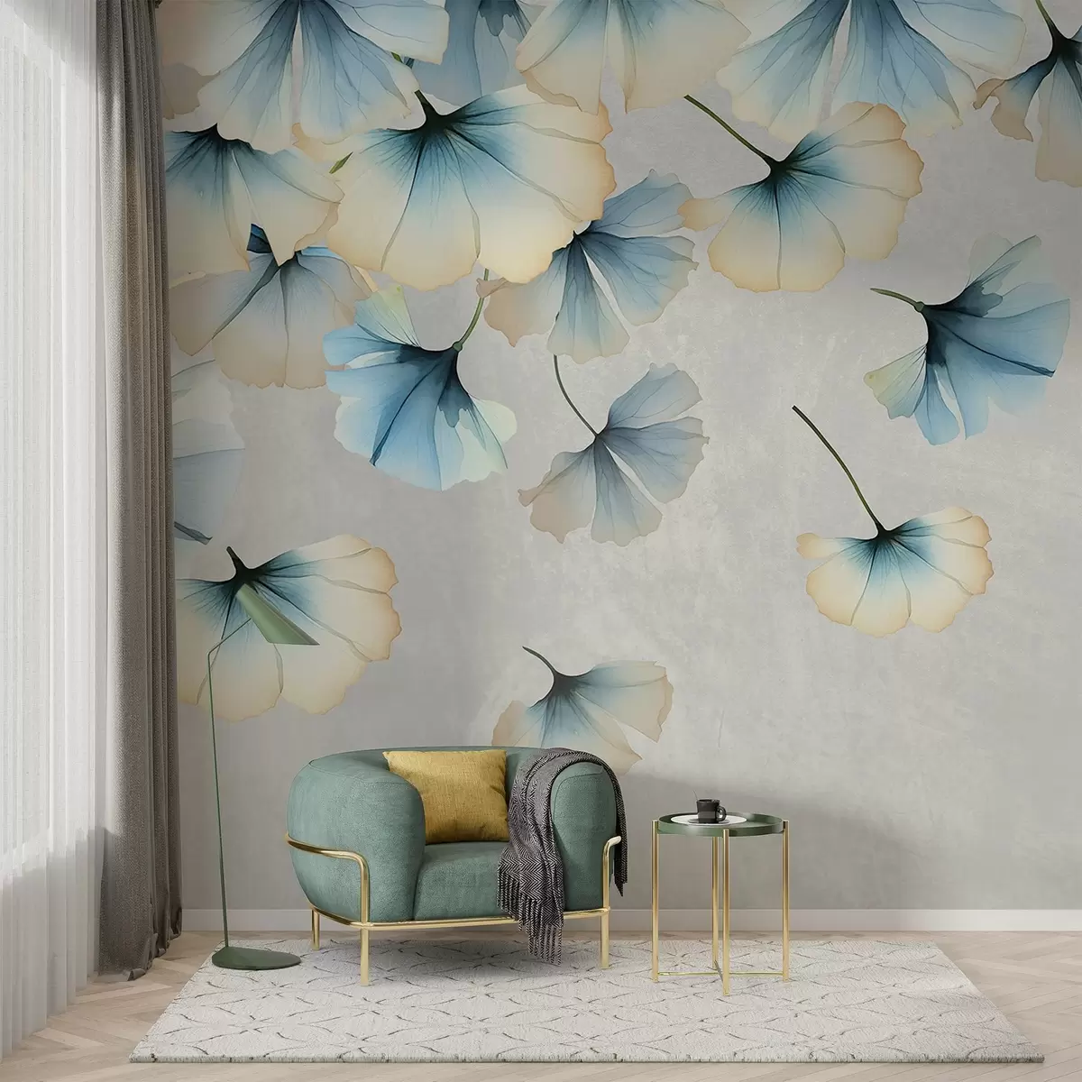 Zidne murale Pastelno plavo i žuto lišće ginka s nježnim laticama koje lebde u zraku na teksturalnoj pozadini br. w08578v1